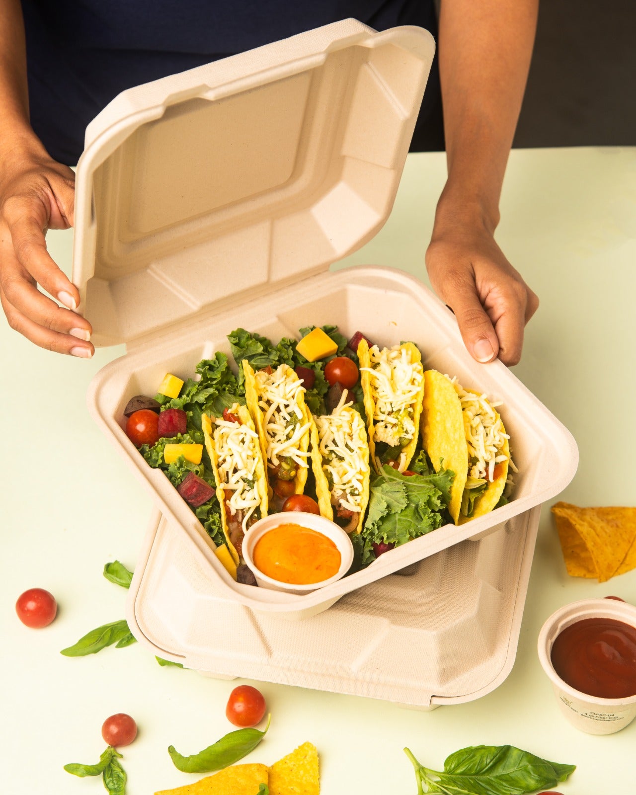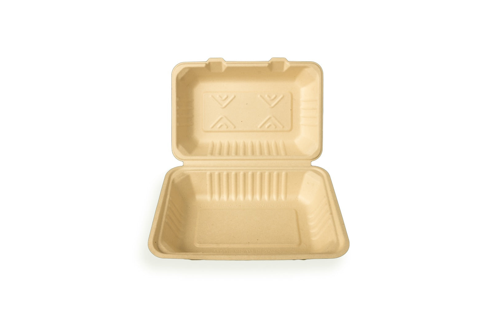 The 9×9 inch white plant fibre clamshell is designed for packaging takeaway meals in food service, catering, and takeaway environments. Made from plant fibre material, it provides a sturdy and practical solution for holding a variety of hot or cold food items. Its hinged clamshell design allows for easy closing and secure food packaging, making it suitable for restaurants, cafés, food trucks, and events.